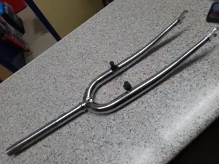 Tija de sillín clásica para bicicleta de montaña (MTB). Fabricada en metal cromado brillante. - Diseño tubular. - Dos soportes negros para cables.