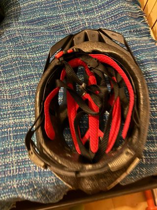 Casco de la marca MET, ideal para ciclismo. - Diseño interior con almohadillas rojas. - Sistema de ajuste con correas negras.