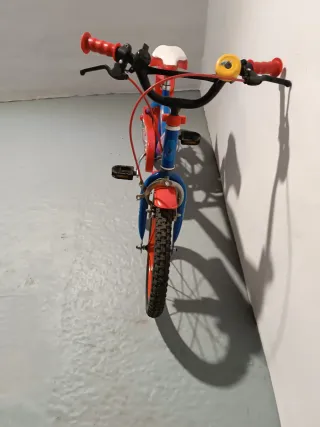 Bicicleta infantil con diseño de Spiderman, ideal para los más pequeños. - Color azul y roja. - Ruedines incluidos. - Timbre amarillo.