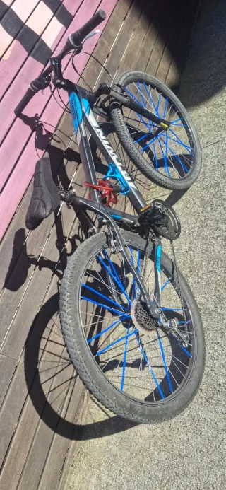 Bicicleta de montaña con detalles en azul y negro. Lista para rodar. - Cuadro de aluminio. - Ruedas de 26 pulgadas - Suspensión delantera.