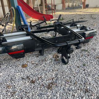 Portabicicletas completo listo para usar. Incluye placa con matrícula, sistema de iluminación trasero y estructura metálica para fijar bicicletas con seguridad. Ideal para viajes, vacaciones o transporte diario. Ha tenido uso pero está fuerte y funcional. Tipo: Para coche con bola de remolque. Estado: Usado, con desgaste estético del soporte metálico (óxido superficial), pero todo operativo.