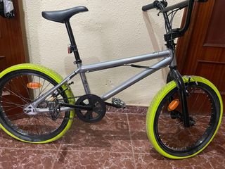 Bicicleta BMX de color gris con detalles en negro y llamativas ruedas de color amarillo. Se ha usado dos veces esta nueva. - Cuadro de metal resistente. - Manillar negro. - Sillín negro.