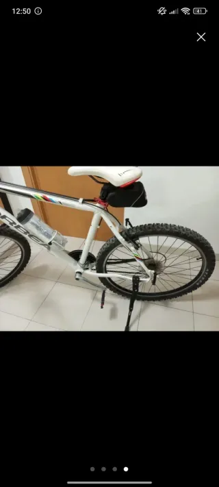 Bicicleta de montaña con suspensión delantera y trasera. - Cuadro blanco y azul. - Ruedas de 26 pulgadas. - Frenos de disco. Lleva varios extras. Le puse pedales nuevos,caballete.Lleva el volante levantado,para ir recto. Solo se ha usado dos veces,se vende por problemas de salud.