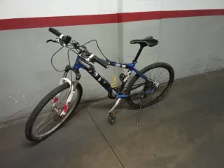 Unico defecto es que ha estado tiempo parada i la suspension esta bloqueada. 8 piñones y tres platos. Cuadro de aluminio. Cambio shimano.