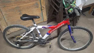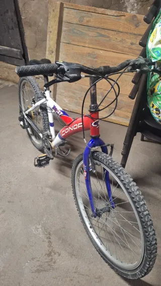 Bicicleta de montaña Conor de tamaño mediano, con un diseño llamativo en blanco, rojo y azul. - Cuadro de aluminio. - Ruedas de 26 pulgadas. - Frenos V-Brake. - Cambio Shimano.