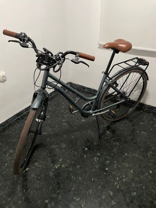 Bicicleta de paseo Elops 520 en color verde militar. Ideal para desplazamientos urbanos y paseos. - Cuadro de acero. - Ruedas de 28 pulgadas. - Sillín cómodo. - Portabebés trasero no incluido en el precio( pregunta si lo quieres) La bici está en perfecto estado para su uso y es preciosa.Precii nueva 350€.
