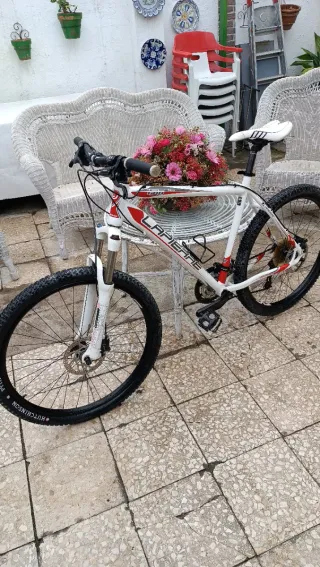 Bicicleta de montaña Lapierre con un diseño llamativo en blanco y rojo. - Cuadro de aluminio. - Ruedas de 29 pulgadas. - Frenos de disco. - Horquilla delantera con suspensión.