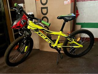 La bicicleta en la imagen es una Coluer Rider 20, un modelo diseñado específicamente para niños de entre 6 y 8 años (o aproximadamente de 120 a 135 cm de altura). Este modelo destaca por su cuadro de aluminio ligero y una geometría adaptada para facilitar el manejo a los más jóvenes. Características Principales Transmisión: Equipada con un sistema Shimano de 6 velocidades, que suele utilizar un mando Revoshift para facilitar los cambios. Suspensión: Incluye una horquilla de suspensión delantera (modelo Race 386 de 20") para mejorar la comodidad en terrenos irregulares. Componentes: Cuenta con frenos V-brake de
