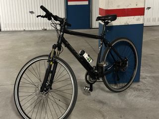 Bicicleta híbrida de color gris con detalles en rojo. Ideal para desplazamientos urbanos y rutas. Tiene dos años y se ha usado muy poco, solo en verano. - Cuadro de aluminio. - Ruedas de 28 pulgadas. - Frenos de disco. - Portabidón incluido. Recoger en vendedor.