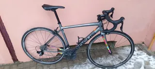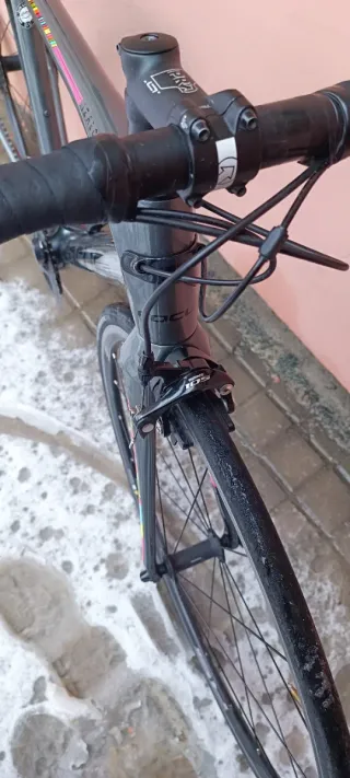 Bicicleta en buen estado, talla L, yo mido 179 cm, con cuadro de carbono, cambio shimano 105, perfectamente cuidada y revisada, es una bici reactiva, bastante cómoda en cuanto posición, para hacer largas distancias. Se entregaría con las ruedas que me vinieron de serie y sin pedales. En una de las fotos se vé un pequeño picotazo que afecta a la pintura únicamente, habrá sido una piedrecilla que saltaría, porque ni me había enterado. Por lo demás, alguna marca sin importancia en las manetas de freno de guardarla en trastero y del uso y poco más, se puede ver sin compromiso.