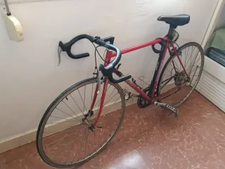 Bicicleta de carretera vintage, ideal para coleccionistas o amantes del ciclismo clásico. Su diseño atemporal la hace destacar. - Cuadro de metal no carbono - Ruedas de 700c. - Manillar de carretera azul. - Sillín negro con bolsa azul. - Portabidones.