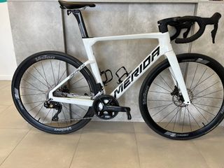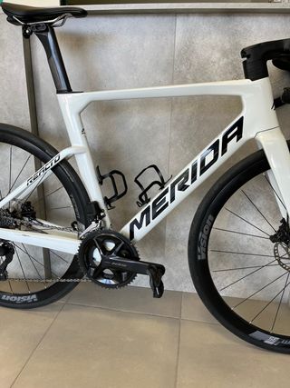 Bicicleta de carretera Merida Reacto 5000 en color blanco. Diseñada para un rendimiento aerodinámico y velocidad. Talla S - Cuadro de carbono. - Ruedas Vision Team 35. - Frenos de disco. - Transmisión Shimano 105 DI2 Se entrega con factura a nombre del comprador para la garantia. Bicicleta de Ocasion, tendra sobre unos 1000km aprox.