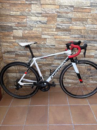 Bicicleta de carretera Orbea en color blanco con detalles en rojo y negro. Ideal para entrenamientos y rutas. Se vende por cambio de talla. Super cuidada y esta como nueva realmente. - Cuadro de carbono. - Manillar de carretera. - Talla 52 - Monta grupo ultegra