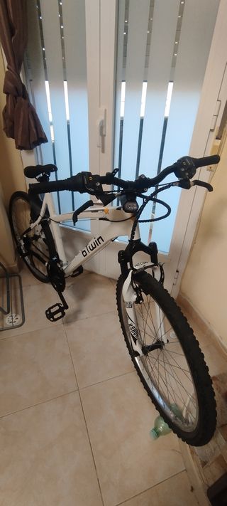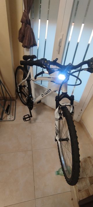 Bicicleta Btwin Rockrider 5.1 en color blanco y pequeños detalles en negro -Para montaña y carretera -Cambio de 7 marchas - Cuadro de aluminio resistente - Suspensión delantera. - Frenos de disco(DELANTERO Y TRASERO) -La doy con una linterna potente delantera y bocina con diferentes pitidos a elegirr , se puede carga a luz solar o a cable tipo C -Esta como nueva , la vendo porque ya no la uso CUALQUIER DUDA NO DUDES EN ESCRIBIRME