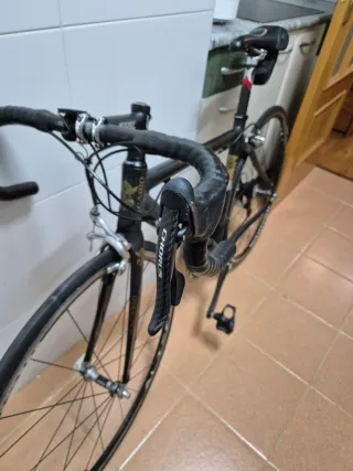 Cuadro de carbono en talla M. En la foto aparece mejorada con ruedas tubulares de carbono de 45mm de perfil, sillín, tija y manillar en carbono quedando en un peso de 7 ́5k con pedales spd. Dispongo además de otra rueda trasera de carbono igual a la montada. También se podria negociar el precio sustituyendo las ruedas de carbono por las shimano originales. La bici está en orden de marcha sin problemas mecánicos
