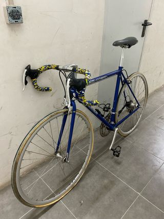 Bicicleta de carretera BH Súpercrono del año 1986. Un modelo clásico para coleccionistas o amantes del ciclismo vintage. - Cuadro de acero. - Color blanco y azul. - Manillar de carretera con cinta azul. - Ruedas de 700c.