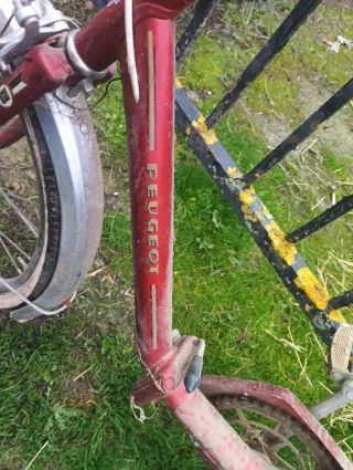 Bicicleta clásica de la marca Peugeot en color rojo. Un modelo icónico para coleccionistas o para quienes buscan un estilo vintage. - Cuadro de metal. - Detalle de líneas doradas en el cuadro. - Marca Peugeot visible en el cuadro.