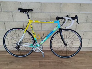 Bicicleta de carretera retro Zeus Roubaix con un diseño llamativo. - Talla 56 - Cuadro Columbus Altec 2 de aluminio 7005. - Horquilla de carbono. - Manetas y tija: Campagnolo Record Carbono - Desviador delantero y frenos: Campognolo Chorus - Desviador trasero: Campagnolo Veloce. - Plato: 52/39 - Cassette: 11/30. 9 velocidades - Llantas 20/13c - Cubiertas completamente nuevas - Color amarillo y azul. - Año 1999 - Algunos rasguños en el cuadro pero bien cuidada.