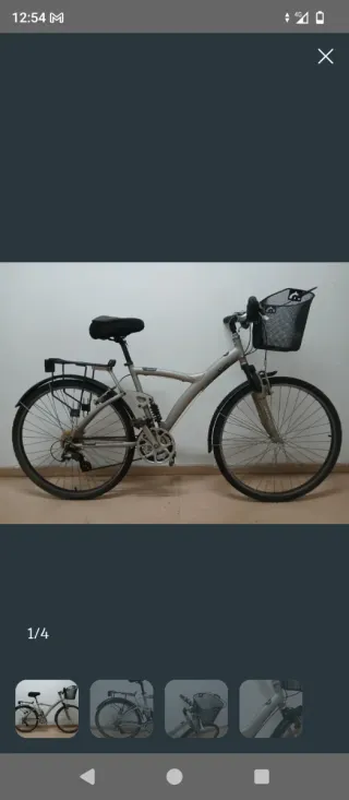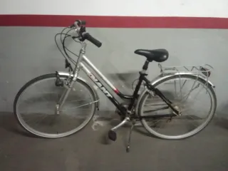 Bicicleta de paseo en color plateado, ideal para desplazamientos urbanos. - Cuadro de aluminio. - Portabultos trasero. - Ruedas de 26 pulgadas - la barra de sillín es corta, la bici tiene que ser para persona no muy alta, baja.
