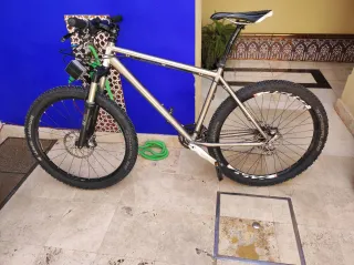 Bicicleta de montaña Charge Duster con cuadro de titanio (Tange Ultimate), ligera y resistente. Los componentes son de alta calidad, aunque muestran signos normales de uso. Todo el sistema de frenos (manetas, cableado, discos y líquido) se ha cambiado recientemente — factura de unos 260 € —, por lo que está lista para salir a rodar. Era parte de un proyecto de cicloturismo que finalmente no voy a realizar. La bici se encuentra en excelente estado mecánico, ideal para quien busque una MTB de titanio bien montada o una base premium para un montaje a medida.
