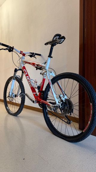 Bicicleta de montaña Cube AMS 100 con doble suspensión. - Cuadro de aluminio. - Horquilla RockShox. - Amortiguador trasero. - Frenos de disco Shimano XT. - Ruedas de 26 pulgadas.