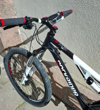 Una MTB con doble suspensión, cuadro de aluminio y rueda de 26" 🔧 Chasis y suspensión Cuadro: Alpha Red Aluminium Horquilla: Fox Amortiguador: Fox Float RP2 Dirección: VP-A76 ⚙️ Transmisión y frenos Mandos: Shimano Deore Desviador: Shimano Deore Cambio: Shimano Deore XT Bielas: Shimano M521 Frenos: Avid Juicy 3 Manetas de freno: Avid Juicy 3 🚲 Ruedas Llantas: Shimano 525 Cubiertas: Bontrager Jones XR 🧩 Componentes Potencia: Bontrager SSR Manillar: Bontrager Race Sillín: Bontrager Race Basic Tija: Bontrager Race Pedales: Shimano M505