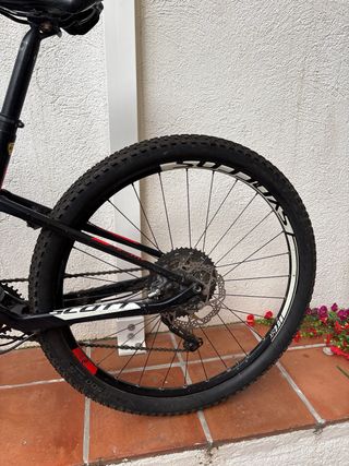 Bicicleta de montaña Scott con doble suspensión. - Cuadro de carbono. - Frenos de disco. - Ruedas Maxxis. - Portabidón incluido. La negra es de marca Scott modelo spark Spark de 18 velocidades Talla M La negra 27.5