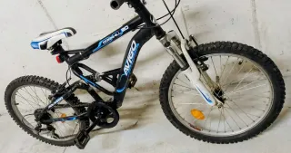 Bicicleta AVIGO, modelo Downhill con ruedas de 20 pulgadas. Doble suspensión, delantera y central. Cambio Shimano. Le falta la carcasa del cambio en la maneta, pero no afecta en absoluto al funcionamiento. Luces delantera y trasera. 6 velocidades. Usada pero bien cuidada siempre. - Cuadro de doble suspensión. - Diseño deportivo en negro y azul. - Sillín con detalles en azul y blanco.