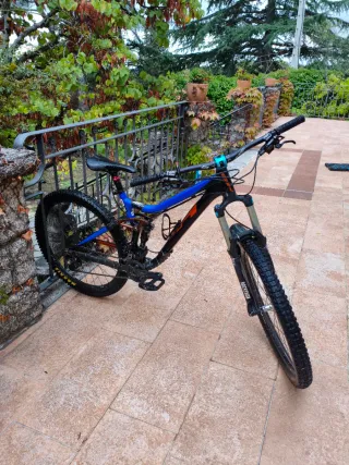 Bicicleta de enduro en color azul y amarillo. - Cuadro de carbono. - Suspensión delantera y trasera. - Frenos de disco hidráulicos. - Ruedas de 27’5 pulgadas.