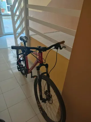 Bicicleta GT Avalanche 2.0 en color rojo, talla M. El cuadro presenta signos de uso. - Horquilla Carbono Rigida. - Ruedas de 29 pulgadas. Syncros. - Neumáticos de 700x32. Nuevos. - Frenos de disco mecanicos nuevos. - Transmisión 2x7v. - Bielas Shimano 46-30 nuevas. - Casete 11-32 7v.