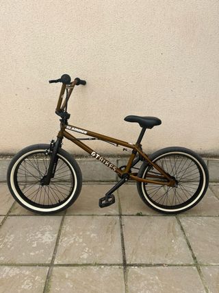Bicicleta BMX GT Slammer de 20 pulgadas, modelo de 2019. Color dorado. algo negociable esta casi nueva,tiene algunos rasguños pero nada grave -Cuadro, horquilla y manillar de acero Hi-Ten -Cigüeñal de 3 piezas de 170mm con bielas forjadas en frío -El manillar se gira completamente(sin dirección, para hacer trucos) -Buje de Cassette completamente sellado -Pedalier americano con rodamientos de bolas