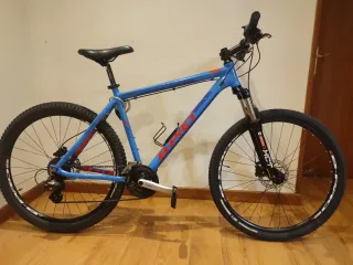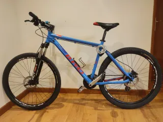 Bicicleta de montaña con ruedas de 27 pulgadas, B-Pro. - Cuadro de aluminio. - Suspensión delantera con llave de bloqueo. - Frenos de disco hidráulico. Incluyendo luz delantera y trasera recargables del decathlon. Incluye tres gomas nuevas, dos en caja y una sin caja. Incluye llanta nueva marca Kendra. Plástico film envolviendo el cuadro de aluminio para proteger la pintura, se puede retirar sin problema.
