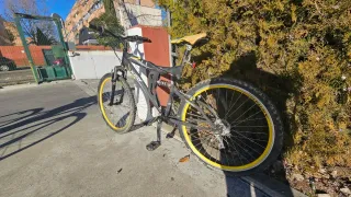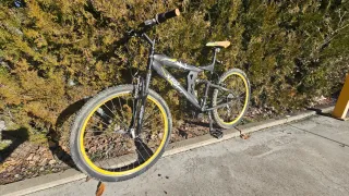 Bicicleta de montaña con ruedas de 26 pulgadas y doble suspensión. - Cuadro robusto. - Ruedas con llantas amarillas. - Hay que cambiar los cambiadores de puño tiene los cables rotos .