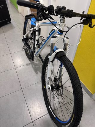 Bicicleta de montaña con cuadro de aluminio ,está nueva bien cuidada con horquilla Fox cambio Shimano ,lo ultimo que se a cambiado las manetas ,los discos y pastillas y latiguillos hidráulicos de los frenos todo está nuevo y va perfecto ,siempre cuidada y siempre sus revisiones ,abstenerse de ofertas el precio el que pone . - Talla 17.5 (44.5 cm). - Serie 6061 Aluminum.