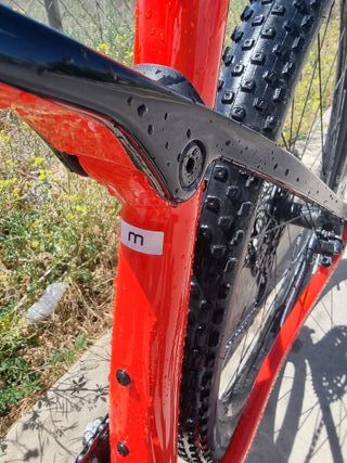 Talla M, cuadro carbono 29 pulgadas, monoplato con dos coronas de 36 y 38 dientes que se cambian sin quitar las bielas, grupo gx eagle 12v, manillar de carbono, horquilla FOX 32, ruedas tubeless.