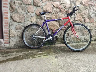 Bicicleta de montaña con un diseño llamativo en colores rojo y morado. - Cuadro de aluminio. - Ruedas de 26 pulgadas. - Frenos V-brake. - Cambio Shimano. - Sillín deportivo.