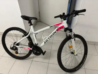 Bicicleta de montaña Rockrider en color blanco, en excelente estado. - Cuadro de aluminio. - Frenos de disco. - Suspensión delantera. - Cambio Shimano.