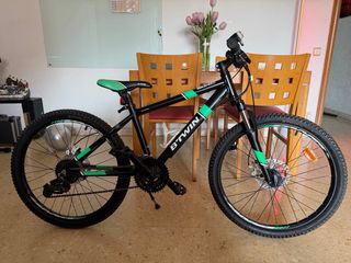 Bicicleta B'Twin Rockrider de 24 pulgadas. - Cuadro de aluminio. - Suspensión delantera. - Frenos de disco. - Diseño en negro con detalles verdes. Usada 2 veces. En un parque infantil.