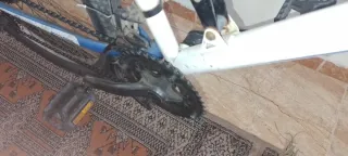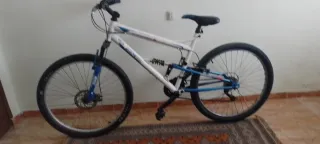 Bicicleta de montaña con doble suspensión. - Cuadro blanco con detalles azules. - Ruedas de 26 pulgadas. - Frenos de disco delanteros. (Falta arreglar la rueda trasera y poner pastillas de freno delantero)