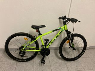 Bicicleta Rockrider ST 500 de Decathlon en color verde lima. - Cuadro de aluminio. - Ruedas de 24 pulgadas. - Frenos de disco. - Suspensión delantera.