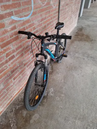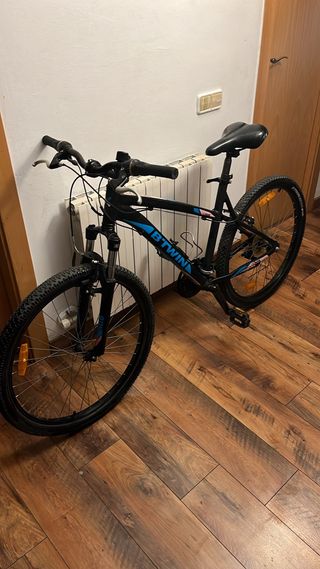 Bicicleta de montaña B'TWIN en color negro con detalles en azul. - Cuadro de aluminio. - Ruedas de 27.5 pulgadas. - Frenos de disco. - Suspensión delantera. Poco usada. Solo necesita engrasar.