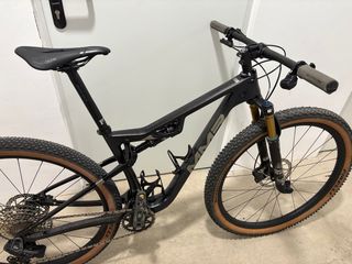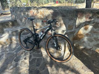 Bici MTB de 29" doble suspensión, talla M,con cuadro de carbono, en perfecto estado y pocos kms y equipamiento de alta gama: Horquilla Fox float 32 de 100mm, amortiguador Fox float performance, frenos hidráulicos Shimano XT, cambio Sram X01, ruedas mavic crossmax,bielas sram 1 de carbono...Además trae equipamiento mejorado como tija telescópica Rock Shox Reverb instalada, sistema tubeless con liquido y válvulas de aluminio Muc Off, Mousse PTN antipinchazos (regalo a parte). Mantenimiento completo de suspensiones recién hecho.Regalo tambien disco de 34T a parte (instalado 32T en la bici). Mejor ver y probar