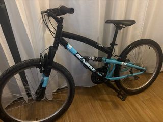 Bicicleta de montaña con doble suspensión y ruedas de 24 pulgadas. - Cuadro negro y detalles en azul. - Frenos delanteros y traseros. - Sillín negro ajustable.