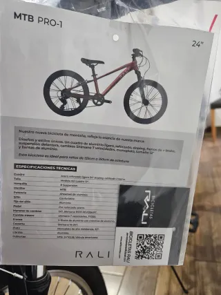Bicicleta de montaña Rali MTB Pro-1 de 24 pulgadas, ideal para niños. Se vende practicamente con un solo uso de un dia , ya que al final no se le ha dado ningun uso. De 8 a 12 años - Cuadro de acero reforzado ligero, sloping, cableado interno. - Horquilla R Suspension. - Manillar MTB. - Potencia Aheadset de aluminio. - Sillín confortable. - Tija del sillín de aluminio. - Pedales PVC reforzado, planos. - Manetas de cambios 1x7 Shimano RS35 REVOSHIFT. - Cambio trasero Shimano 7 velocidades TV300. - Frenos V-Brake de aluminio con manetas de aluminio. - Cassette Shimano 14-34T. - Plato monoplato de alta resistencia, 32
