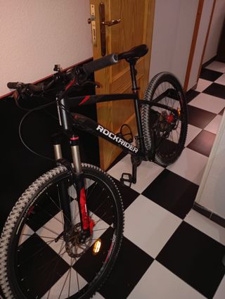 Bicicleta de montaña Rockrider 500S con cuadro de carbono delantero y tirantes en aluminio. Apenas 500km. Ojo, necesita un ajuste del mando de la suspensión. - Suspensión delantera y trasera. - Frenos de disco hidráulicos. - Ruedas de 29 pulgadas. - Cambio SRAM Gx. - Tija telescópica hidráulica.