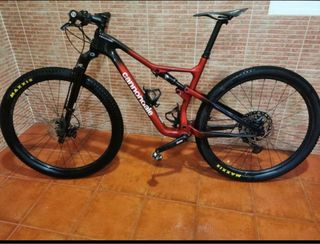 Bicicleta de montaña Cannondale con doble suspensión. - Cuadro de carbono. -Talla L. - Color rojo y negro. -Montada en shimano XT - cubiertas Maxxis.