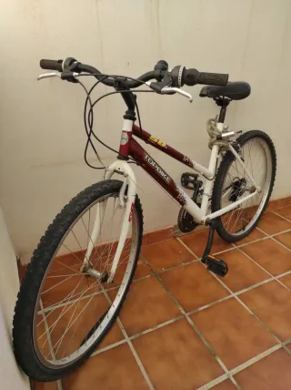 Bicicleta de montaña Topbike 50, ideal para iniciarse en el ciclismo. - Cuadro de color blanco y burdeos. - Las gomas de las ruedas necesitan revisión. - Tiene timbre y candado con llave como accesorios adicionales que no venían originalmente.