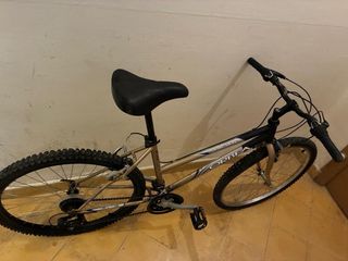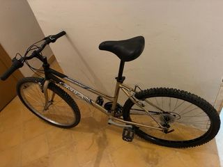 Bicicleta de montaña plateada, ideal para paseos y rutas. - Cuadro de metal resistente. - Ruedas todoterreno. - Sillín negro. - Manillar con puños negros.