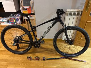 Bicicleta de montaña Giant Talon con ruedas de 27.5 pulgadas. - Cuadro de aluminio. - Frenos de disco. - Cambio Shimano. Precio negociable Año 2024 Se le añade todo lo q esta en arcoíris q no me a dado tiempo a ponerlo