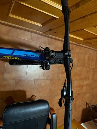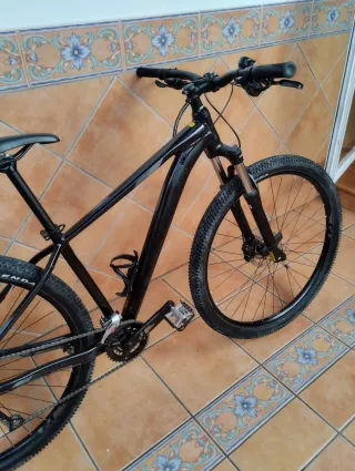 Bicicleta MTB color negro con detalles en azul - Cuadro de aluminio. - Horquilla delantera con suspensión. - Frenos de disco hidráulicos y cambios de la marca Shimano. Con menos de 10 salidas de uso - Ruedas de 29 pulgadas. -Tiene una cámara de repuesto y bomba de inflado